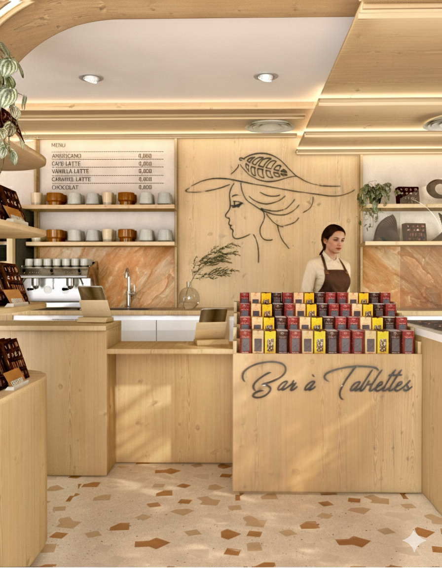 Ce qui était autrefois un espace de vente et un atelier devient un lieu d’expérience : un salon de thé et vente à emporter, où le chocolat ne se contente pas d’être dégusté… il est mis en scène.