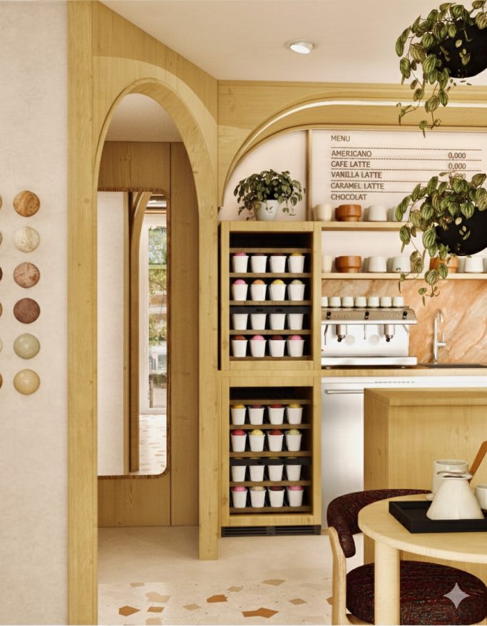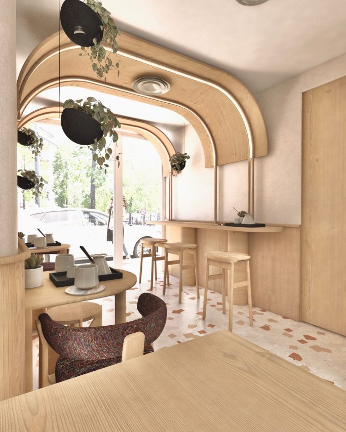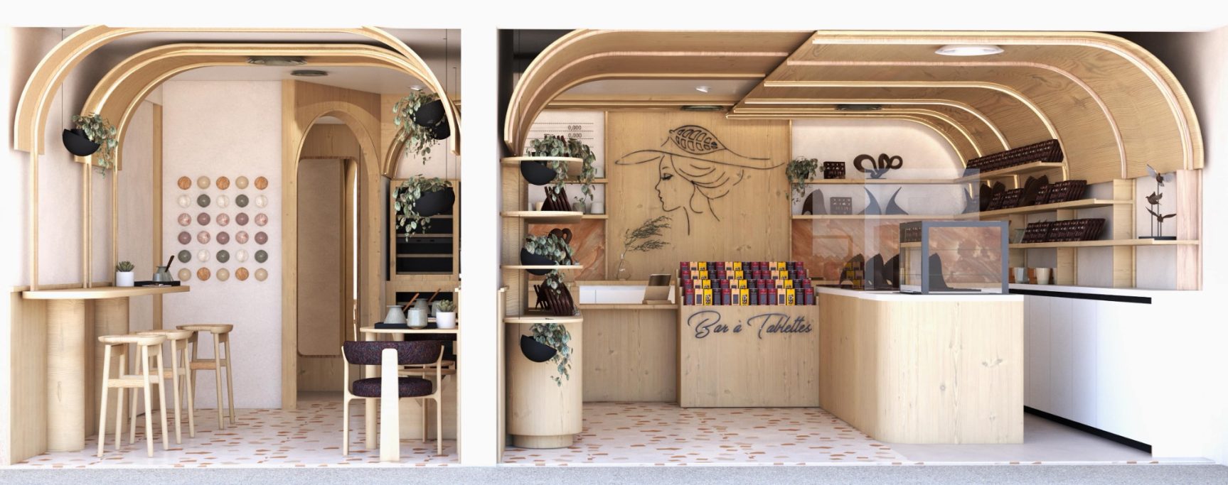 Les plafonds aux bords arrondis en bois enveloppent la boutique et dissimulent l’éclairage principal, comme une voûte douce au-dessus du décor, et les cloisons créées reprennent aussi ce vocabulaire de l’arc et de la voûte.
