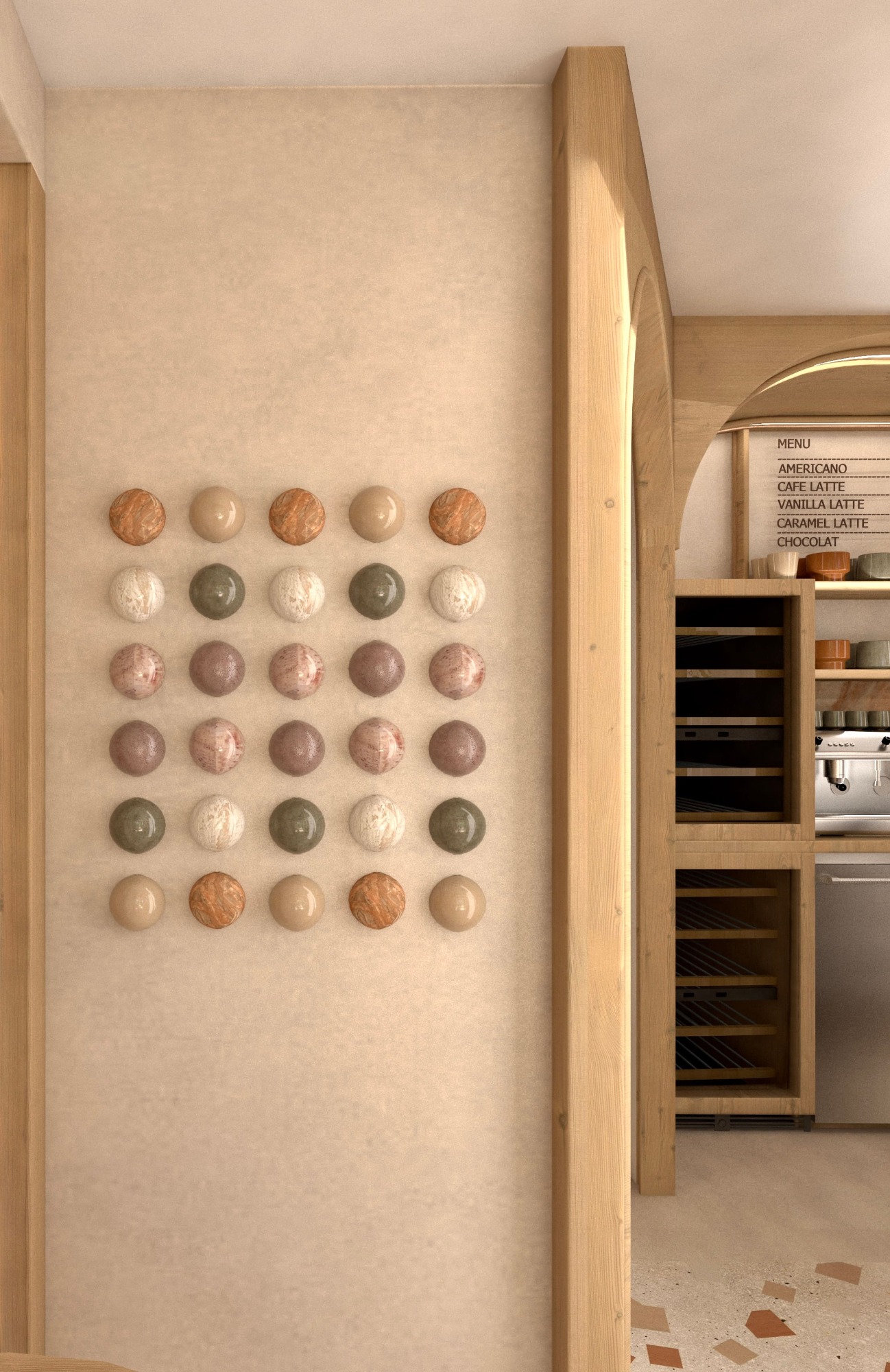 Au sol, un terrazzo singulier prend vie : de grandes incrustations évoquent des carrés de chocolat dispersés, comme si la matière elle-même fondait dans l’espace. La pierre aux teintes de terre rappelle l’origine du cacao, la richesse de la matière brute avant la transformation.